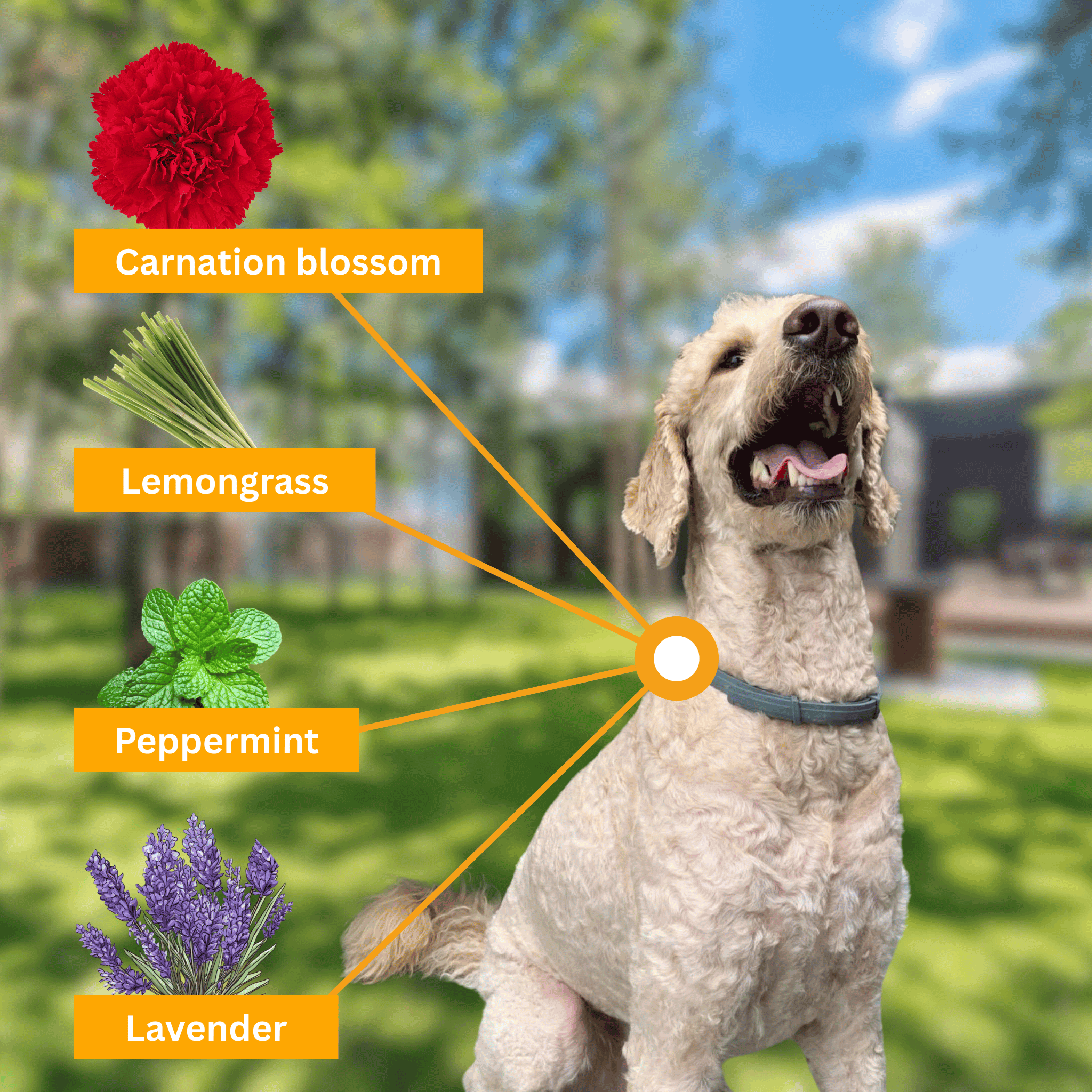 Our collar contains a blend of essential oils—lavender, peppermint, lemongrass, and clove blossom—that naturally repel parasites.